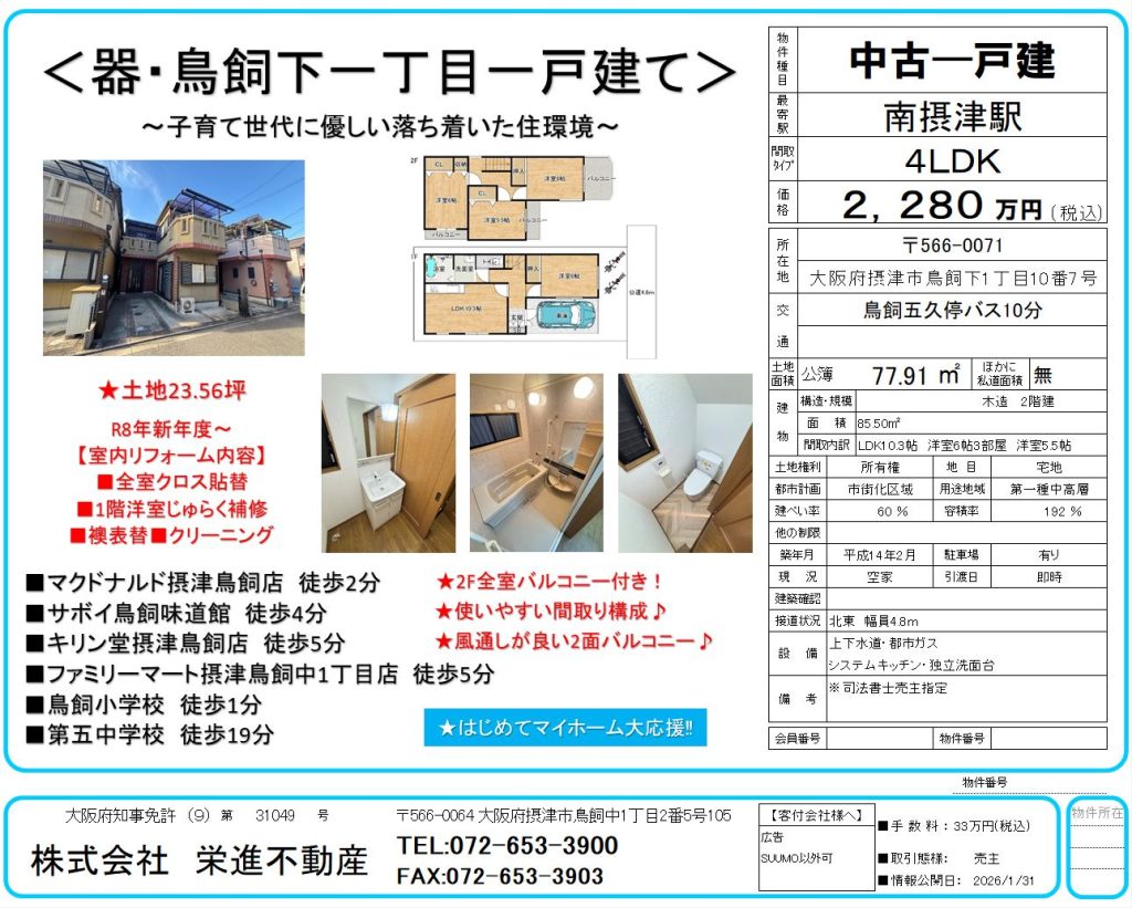 ■鳥飼小学校徒歩5分・第五中学校校区内。
